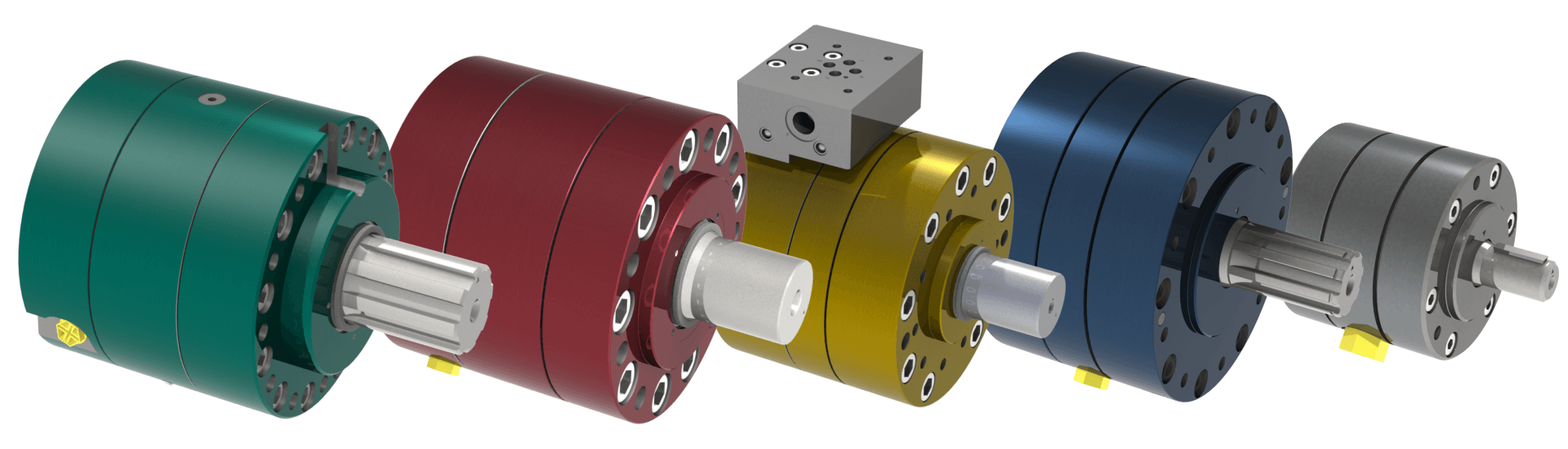 Die Baureihe DKZ wird auch Mini-Drehkolben-Arbeitszylinder genannt und ist für Anwendungen mit geringem Drehmoment zwischen 10 – 20 Nm ausgelegt. Dank ihrer dichtungslosen Bauweise ist sie für besonders hohe Schwenkfrequenzen geeignet. Dabei sind der Schwenkwinkel auf 200° und der Betriebsdruck auf 50 bar begrenzt. Das Drehmoment wird auf der abtreibenden Welle mit Hilfe einer Scheibenfeder-verbindung nach DIN 6888 abgenommen.