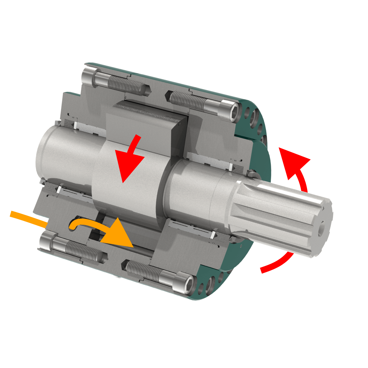 An annular space is formed between a hollow cylinder and a shaft. By means of a piston, which is firmly connected to the shaft, and a partition, which is attached to the housing, this circular space is divided into two working spaces. If pressure is applied to one of the workrooms, a torque is created - the rotary cylinder executes the desired rotary movement. The force generated in this way is transmitted immediately.