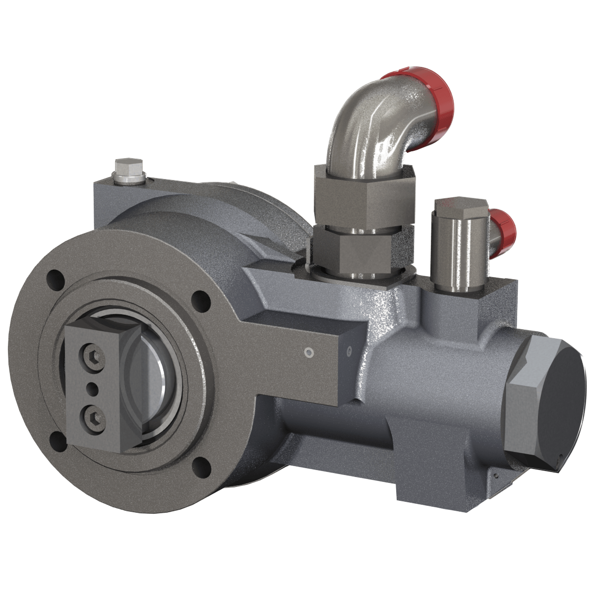 genutzt. Die robuste Kolbenpumpe, bei der die hochbelasteten drehenden Bauteile in Wälzlagern abgefangen sind, wird in ihrem Pumpengehäuse durch Getriebeöl geschmiert. Zum Anbau stehen eine elastische Kupplung sowie spezielle Druckkappen zur Verfügung.